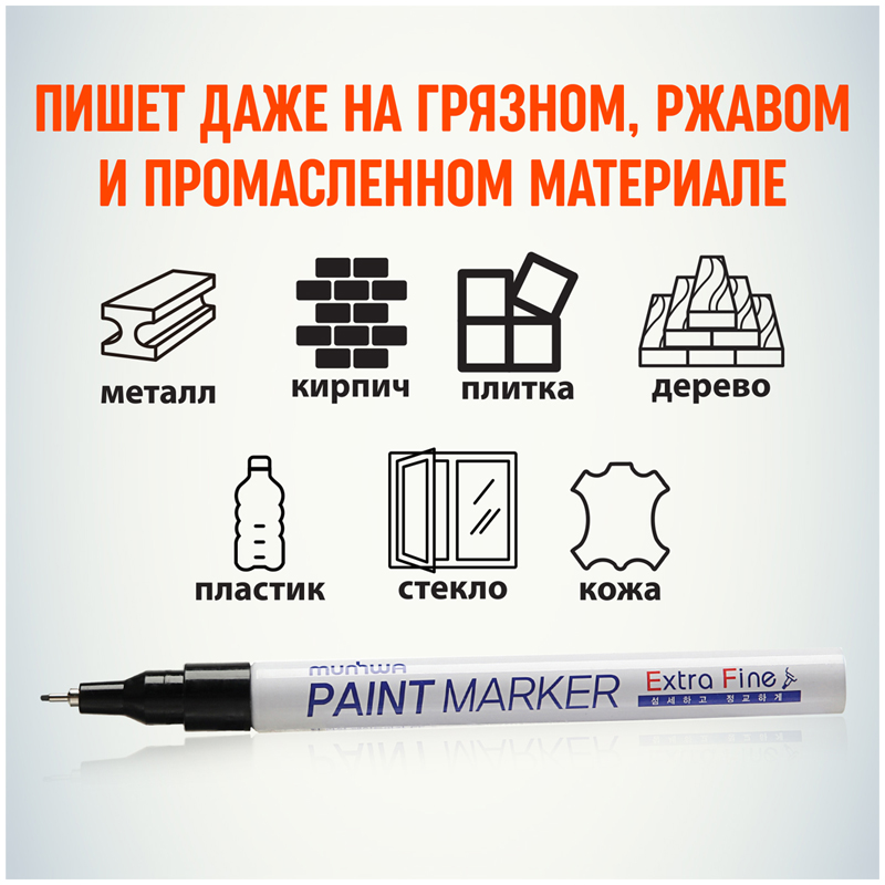 Маркер-краска MunHwa Extra Fine предназначен для нанесения деликатной маркировки на гладкие поверхности (металл, пластмасса, резина, кожа и пр.). Отлично подходит для маркировки фото пленок и рентгеновских снимков, имеет широкое применения в дизайне, декорировании и оформлении.