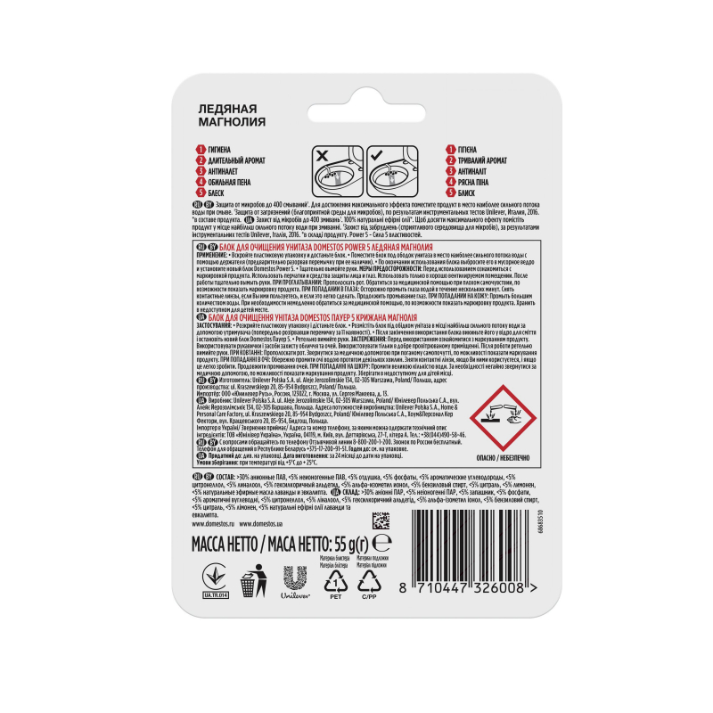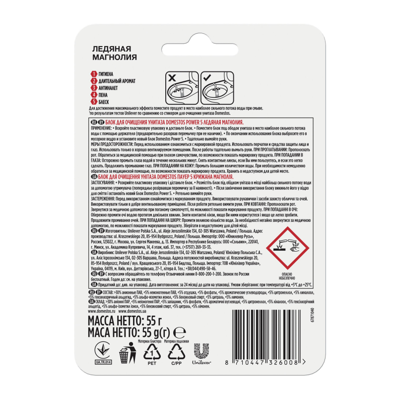 Блок для унитаза гигиенический Domestos Power 5 Ледяная магнолия