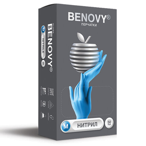 Перчатки нитриловые смотровые КОМПЛЕКТ 50 пар (100 шт.), размер M (средний), голубые, BENOVY Nitrile