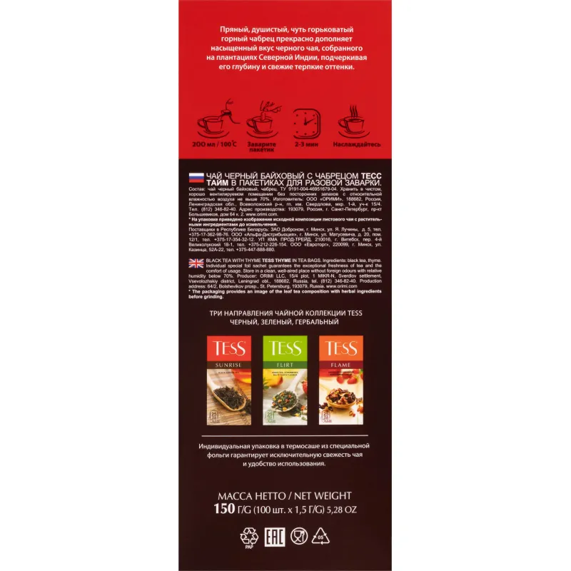 Чай Tess Thyme черный с чабрецом и цедрой лимона 100 пакетиков
