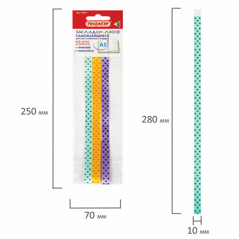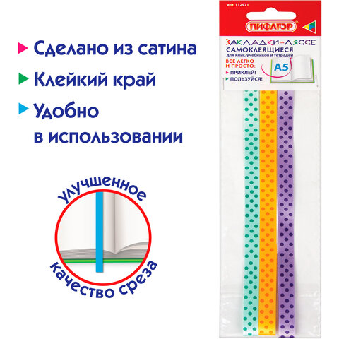 Закладки-ляссе фактурные для книг А5 (длина 28 см) "ФАНТАЗИЯ", клейкий край, 3 ленты, ПИФАГОР, 11297