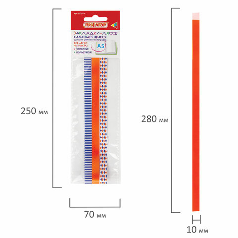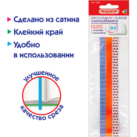 Закладки-ляссе фактурные для книг А5 (длина 28 см) "УЗОРЫ", клейкий край, 3 ленты, ПИФАГОР, 112972