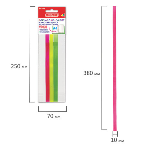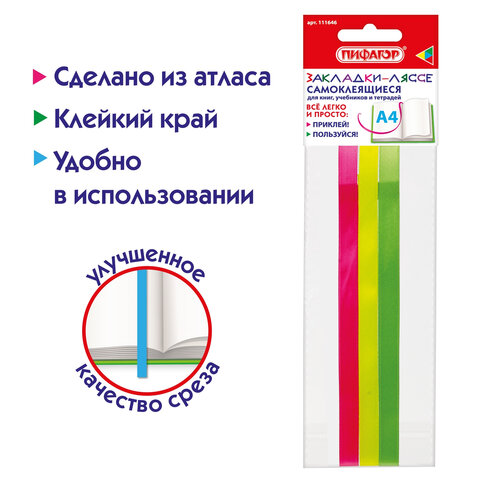 Закладки-ляссе "НЕОН" для книг А4 (длина 38 см) ПИФАГОР, клейкий край, 3 ленты, 111646