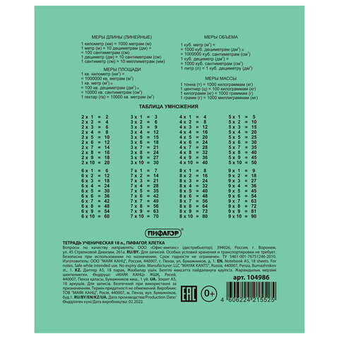 Тетрадь ЗЕЛЁНАЯ обложка 18 л., клетка с полями, офсет №2 ЭКОНОМ, "ПИФАГОР", 104986