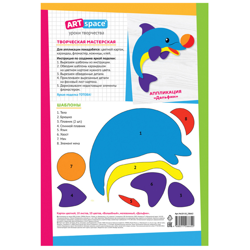 Картон цветной A4, ArtSpace, 10л., 10цв., "Волшебный"(золото, серебро), мелованный в папке, "Дельфин