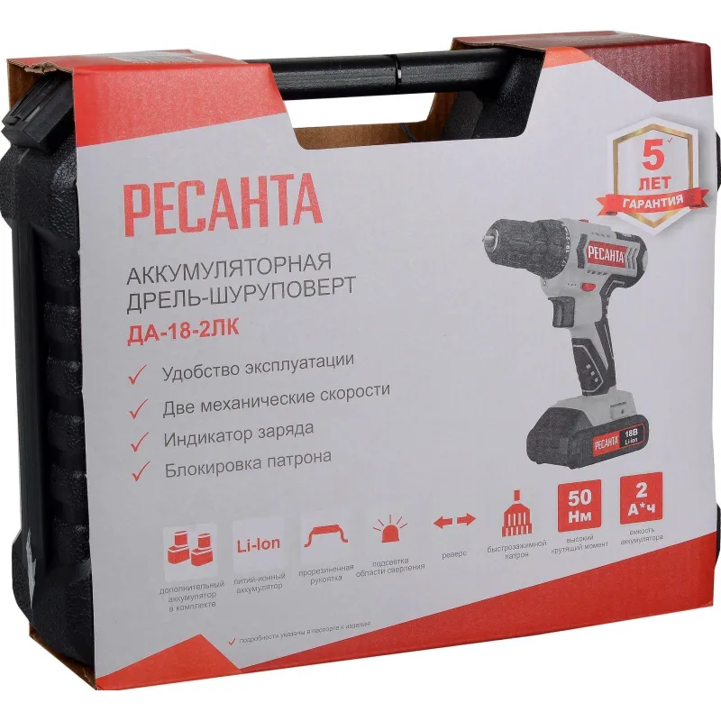 Дрель-шуруповерт аккумуляторная РЕСАНТА 18В, ДА-18-2ЛК (75/14/5)